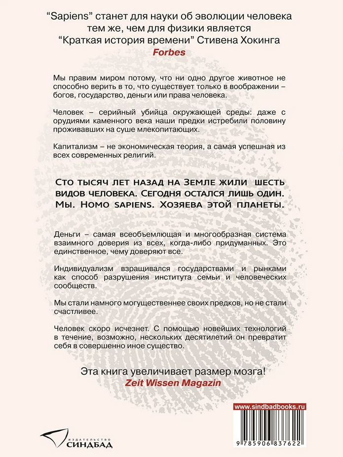 Сто тысяч лет назад Homo sapiens был одним из как минимум шести видов человека, живших на этой планете, - ничем не примечательным животным, которое играло в экосистеме роль не большую, чем гориллы, светлячки или медузы. Но около семидесяти тысяч лет назад загадочное изменение когнитивных способностей Homo sapiens превратило его в хозяина планеты и кошмар экосистемы. Как человек разумный сумел покорить мир? Что стало с другими видами человека? Когда и почему появились деньги, государства и религия? Как возникали и рушились империи? Почему почти все общества ставили женщин ниже мужчин? Как наука и капитализм стали господствующими вероучениями современной эры? Становились ли люди с течением времени счастливее? Какое будущее нас ожидает?