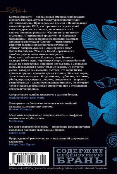 Кормак Маккарти — современный американский классик главного калибра, лауреат Макартуровской стипендии «За гениальность», мастер сложных переживаний и нестандартного синтаксиса, хорошо известный нашему читателю романами «Старикам тут не место» (фильм братьев Коэн по этой книге получил четыре «Оскара») и «Дорога» (получил Пулицеровскую премию и также был экранизирован), «Пограничной трилогией» (первый роман которой, «Кони, кони…», получил Национальную книжную премию США и был перенесен на экран Билли Бобом Торнтоном, главные роли исполнили Мэтт Деймон и Пенелопа Крус) и «Кровавым меридианом».