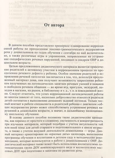 В сборник включены различные игры и упражнения, направленные на устранение специфических речевых нарушений, входящих в синдром ОНР, у детей дошкольного возраста. В соответствии с предложенным планированием занятий с сентября по май включительно специалисты совместно с родителями смогут эффективно корректировать речевые дефекты у детей.
