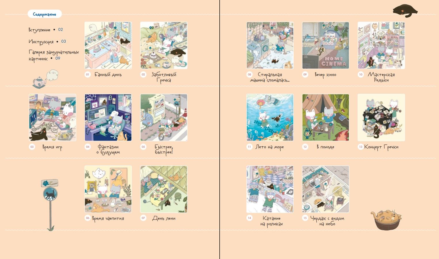 Эта раскраска — милая повседневная история о коте Гречке и его друзьях Редьке, Нори и Желтке. Под одной обложкой — множество сюжетов: отдых на море, уютные чаепития, уютный вечер кино и многое другое!