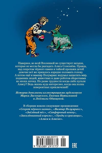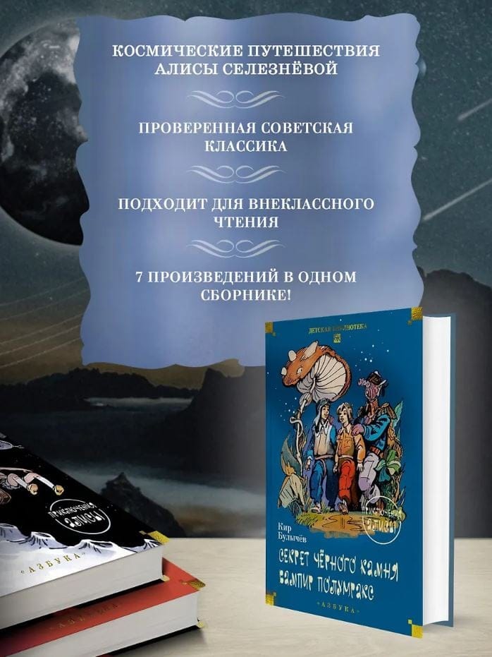 Наверное, во всей Вселенной не существует загадок, которые не могла бы разгадать Алиса Селезнёва. Правда, над секретом чёрного камня и тайной пропажи детей девочке всё же пришлось изрядно поломать голову. А потом ещё и вампир Полумракс вздумал захватить мир, подменив людей, животных и даже роботов оборотнями из эпохи легенд. Но разве трудности когда-либо пугали Алису? Ведь жизнь куда интереснее, когда она полна невероятных приключений!