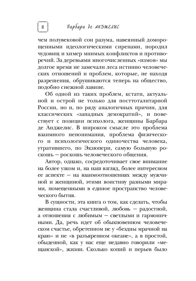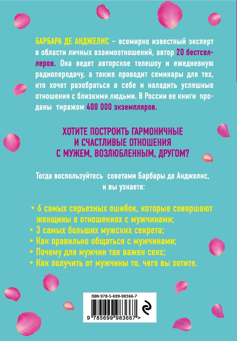Барбара де Анджелис — один из самых популярных в мире экспертов по отношениям и автор более чем 20 бестселлеров. Она ведет авторское телешоу и ежедневную радиопередачу, а также проводит семинары для тех, кто хочет разобраться в себе и наладить успешные отношения с близкими людьми. «Секреты о мужчинах, которые должны знать каждая женщина» — для тех, кто понимает, что во многом от них зависит, какими будут отношения с партнером.