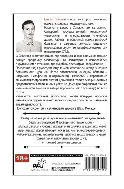 Михаил Бажмин — врач во втором поколении, психиатр, кандидат медицинских наук. Родился и вырос в Самаре, там же окончил Самарский государственный медицинский университет по специальности «лечебное дело». Работал в областной психиатрической больнице в закрытом женском отделении и преподавал студентам на кафедре психиатрии и наркологии СГМУ. С 2012 года живет в Израиле, где после сдачи всех экзаменов прошел полную программу резидентуры по психиатрии и психотерапии в крупнейшем в стране центре судебной психиатрии Шаар Менаше. Последние годы руководит отделением сочетанной (когда у одного больного есть два или более заболеваний из одной области — например, шизофрения и наркомания) патологии и параллельно занимается построением системы домашней госпитализации (система предоставления медицинских услуг на дому при сохранении той же интенсивности лечения и набора персонала, как в больнице) по всей стране. Увлекается восточным искусством, коллекционирует японское антикварное оружие и имеет несколько черных поясов по различным видам единоборств. Преподает студентам и начинающим врачам в Шаар Менаше. Почему серийных убийц признают вменяемыми? Где грань между безумием и нормой? И вообще, что такое норма? Михаил Бажмин, судебный психиатр, на случаях из практики, порой трагических, порой забавных, покажет, как причудливо работает человеческий мозг, как недалеко мы ушли от наших предков и какая тонкая линия отделяет каждого из нас от темной стороны сознания.