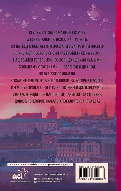 Ктулху. В этом романе нет Ктулху. А все остальное, пожалуй, тут есть. Ах да, еще в нем нет Интернета, его запретили Инсеки! И Луны нет, поскольку они раздробили ее на куски. Над Землей теперь Лунное кольцо с двумя самыми большими осколками — Селеной и Дианой. Но все уже привыкли. К тому же теперь есть кристаллики, за которые Продавцы могут продать что угодно. Хотя бы и Джоконду. Или две Джоконды, обе настоящие, такие же, как в Лувре Довольно доброе начало апокалипсиса, правда?