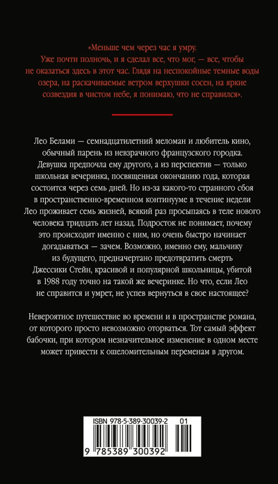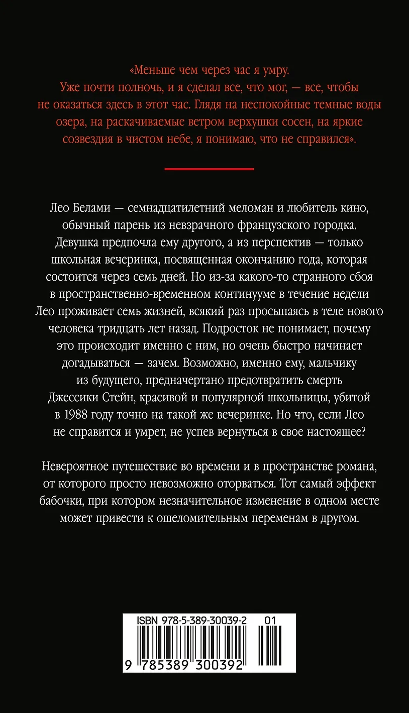 Лео Белами — семнадцатилетний меломан и любитель кино, обычный парень из невзрачного французского городка. Девушка предпочла ему другого, а из перспектив — только школьная вечеринка, посвященная окончанию года, которая состоится через семь дней. Но из-за какого-то странного сбоя в пространственно-временном континууме в течение недели Лео проживает семь жизней, всякий раз просыпаясь в теле нового человека тридцать лет назад. Подросток не понимает, почему это происходит именно с ним, но очень быстро начинает догадываться — зачем. Возможно, именно ему, мальчику из будущего, предначертано предотвратить смерть Джессики Стейн, красивой и популярной школьницы, убитой в 1988 году на точно такой же вечеринке. Но что, если Лео не справится и умрет, не успев вернуться в свое настоящее?