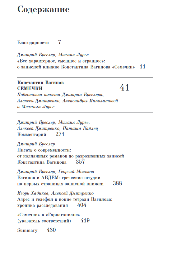 Константин Вагинов (1899–1934) — один из наиболее самобытных писателей 1920-х — начала 1930-х годов, издавший четыре поэтических сборника и написавший четыре романа. Он был вхож в разные поэтические и интеллектуальные круги: в объединение «Звучащая раковина» Н. С. Гумилева, в «Кольцо поэтов им. К. К. Фофанова», в круг М. А. Кузмина и М. М. Бахтина, в переводческий кружок АБДЕМ и объединение ОБЭРИУ. В архиве писателя есть объемная тетрадь, бо́льшая часть которой, озаглавленная «Семечки», отведена под записи, отображающие повседневный опыт его взаимодействия с речевой и текстуальной средой. Язык городской улицы, трамвайные разговоры, услышанные в очередях анекдоты перемежаются на страницах тетради с цитатами из афиш, объявлений и книг, отобранными с отчетливым пристрастием к фиксациям устной речи. «Семечки», хотя они и не задумывались как самостоятельное произведение, наделены очевидной творческой прагматикой: именно здесь наиболее радикально и последовательно разработана поэтическая проблематика и литературная техника, важные для Вагинова в начале 1930-х: крайние формы сочетаемости дискурсов и стилей, включение живой речи в литературное произведение, приемы коллажного повествования. Несмотря на то что тетрадь давно известна исследователям творчества Константина Вагинова, она опубликована лишь фрагментарно. В настоящем издании впервые дается полная публикация записной книжки Константина Вагинова, сопровожденная рядом статей, комментарием и иллюстрациями.