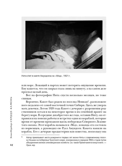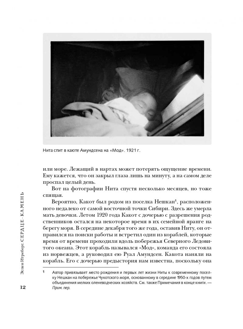 Руаль Амундсен - легенда покорения полюсов Земли, национальный герой Норвегии, "Наполеон полярных стран" et ceterа. Такого Амундсена знают все. Однако в его биографии есть не столь известный широкой публике факт — история удочерения им двух чукотских девочек. В 1921 году, после неудачной экспедиции на борту "Мод", великий полярный исследователь вернулся в свое имение Свартскуг на берегу Буннефьорда с двумя девочками - эскимоской 4 лет и полуэскимоской приблизительно 12-ти. Несколько лет, в период между двумя мировыми войнами, жизни Руала Амундсена, Камиллы Карпендейл и Ниты Какот Амундсен переплетались между собой. Вся эта личная, весьма сложная и противоречивая история — двух детей и взрослого, всемирно известного полярника — стала предметом интереса известного норвежского автора и исследователя жизни Р. Амундсена Эспена Итреберга. Книга рассказывает о жизненном пути Ниты Какот и Камиллы Карпендейл, о том, как их судьба причудливым образом переплелась с судьбой самого Амундсена, и почему ему пришлось вернуть их на родину. Эта история о силах, которые сначала свели, а потом разъединили их. Сегодня читатели могут познакомиться с этой непростой историей и ответить на вопрос: все же сердце — камень? Автор книги опирался не только на документальные источники, но и на личные впечатления от поездок по тем местам, где жили девочки во время своих странствий.