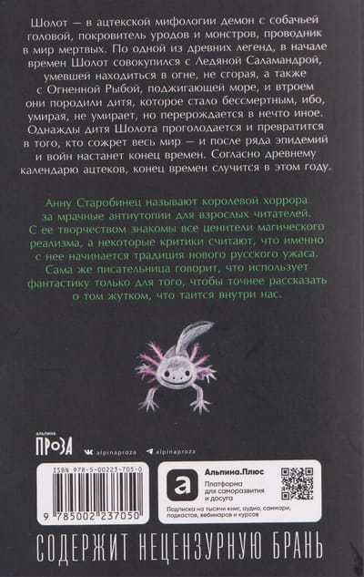 Анну Старобинец называют королевой хоррора за мрачные антиутопии для взрослых читателей. С ее творчеством знакомы все ценители магического реализма, а некоторые критики считают, что именно с нее начинается традиция нового русского ужаса. Сама же писательница говорит, что использует фантастику только для того, чтобы точнее рассказать о том жутком, что таится внутри нас.