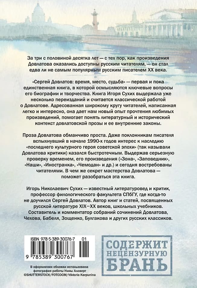 «Сергей Довлатов: время, место, судьба» — первая и пока единственная книга, в которой осмысляются ключевые вопросы его биографии и творчества. Книга известного литературоведа и критика Игоря Сухих выдержала уже несколько переизданий и считается классической работой о Довлатове. Адресованная широкому кругу читателей, написанная легко и интересно, она дает нам новый опыт прочтения любимых произведений, помогает понять литературный и исторический контекст довлатовской прозы и ее внутренние законы.