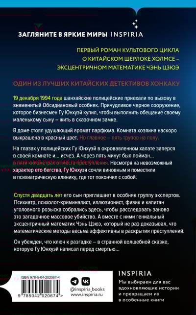 Спустя двадцать лет его сын приглашает в особняк группу экспертов. Психиатр, психолог-криминалист, иллюзионист, физик и капитан уголовного розыска собрались здесь, чтобы расследовать заново это загадочное массовое убийство. А вместе с ними гениальный эксцентричный математик Чэнь Цзюэ, который не раз доказывал, что математические методы весьма эффективны в раскрытии преступлений. Он убежден, что ключ к разгадке — в странной волшебной сказке, которую Гу Юнхуэй написал перед смертью…