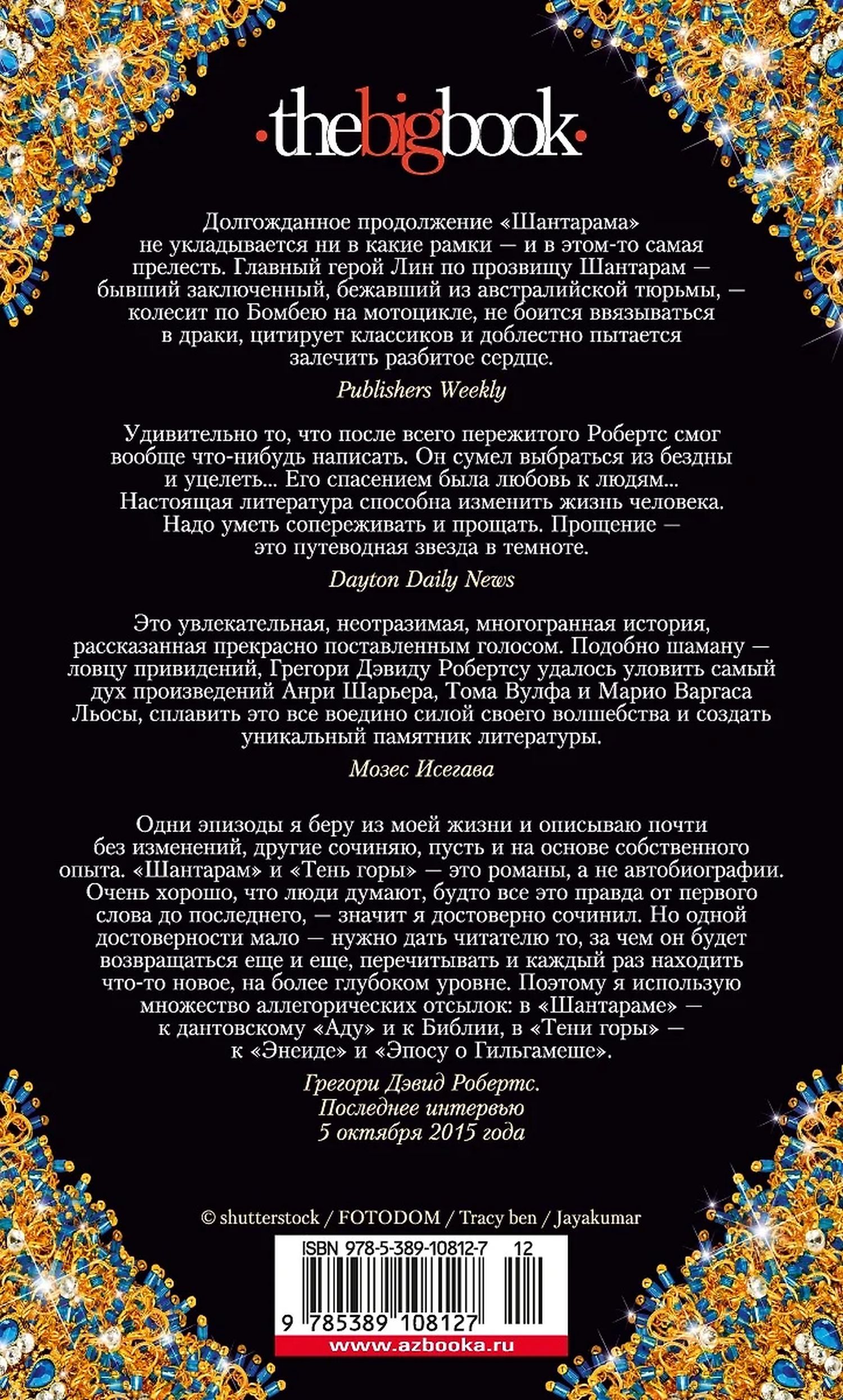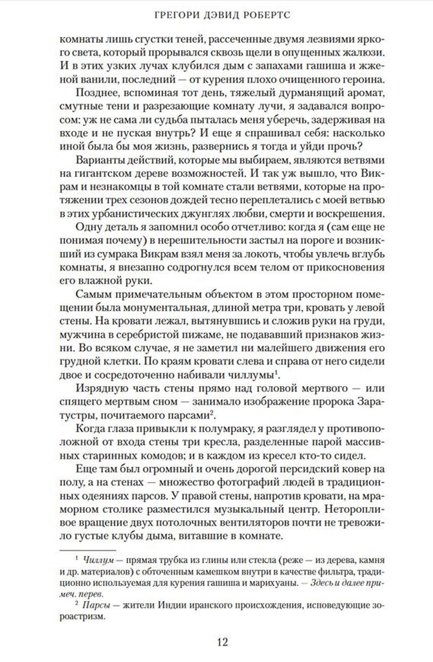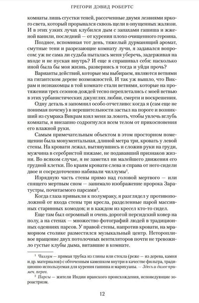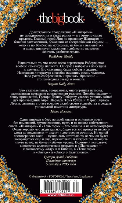 «Шантарам» - это была преломленная в художественной форме исповедь человека, который сумел выбраться из бездны и уцелеть, разошедшаяся по миру тиражом четыре миллиона экземпляров (из них полмиллиона - в России) и заслужившая восторженные сравнения с произведениями лучших писателей нового времени, от Мелвилла до Хемингуэя. Маститый Джонатан Кэрролл писал: «Человек, которого «Шантарам» не тронет до глубины души, либо не имеет сердца, либо мертв... «Шантарам» - «Тысяча и одна ночь» нашего века. Это бесценный подарок для всех, кто любит читать». И вот наконец Г. Д. Робертс написал продолжение истории Лина по прозвищу Шантарам, бежавшего из австралийской тюрьмы строгого режима и ставшего в Бомбее фальшивомонетчиком и контрабандистом. Итак, прошло два года с тех пор, как Лин потерял двух самых близких ему людей: Кадербхая - главаря мафии, погибшего в афганских горах, и Карлу - загадочную, вожделенную красавицу, вышедшую замуж за бомбейского медиамагната. Теперь Лину предстоит выполнить последнее поручение, данное ему Кадербхаем, завоевать доверие живущего на горе мудреца, сберечь голову в неудержимо разгорающемся конфликте новых главарей мафии, но главное - обрести любовь и веру.