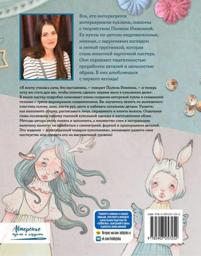 Все, кто интересуется интерьерными куклами, знакомы с творчеством Полины Инякиной. Ее куклы по-детски очаровательные, нежные, с задумчивым взглядом и легкой грустинкой, которая стала визитной карточкой мастера. Они поражают тщательностью проработки деталей и цельностью образа. В них влюбляются с первого взгляда! В книге мастер подробно описывает все этапы создания авторской куклы в смешанной технике с тремя шарнирными соединениями. Вы научитесь лепить из запекаемого пластика голову, шею, кисти рук, шить и набивать остальные детали. Узнаете, как выполнять сборку, расписывать лицо, окрашивать и клеить волосы. Отдельная глава посвящена пошиву съемной кукольной одежды и изготовлению обуви, а в разделе «Заключение» вас ждет галерея работ художника. Методы автора легко запоминаются, а множество схем в натуральную величину помогут не ошибиться с симметрией, формой и пропорциями деталей при лепке и росписи. К концу работы у вас в руках появится готовая кукла, как если бы посетили «живой» мастер-класс. Великолепные фотографии, авторский дизайн, уникальный опыт. Это издание - долгожданный подарок кукольникам, желающим развить свое мастерство или поднять его на выставочный уровень!