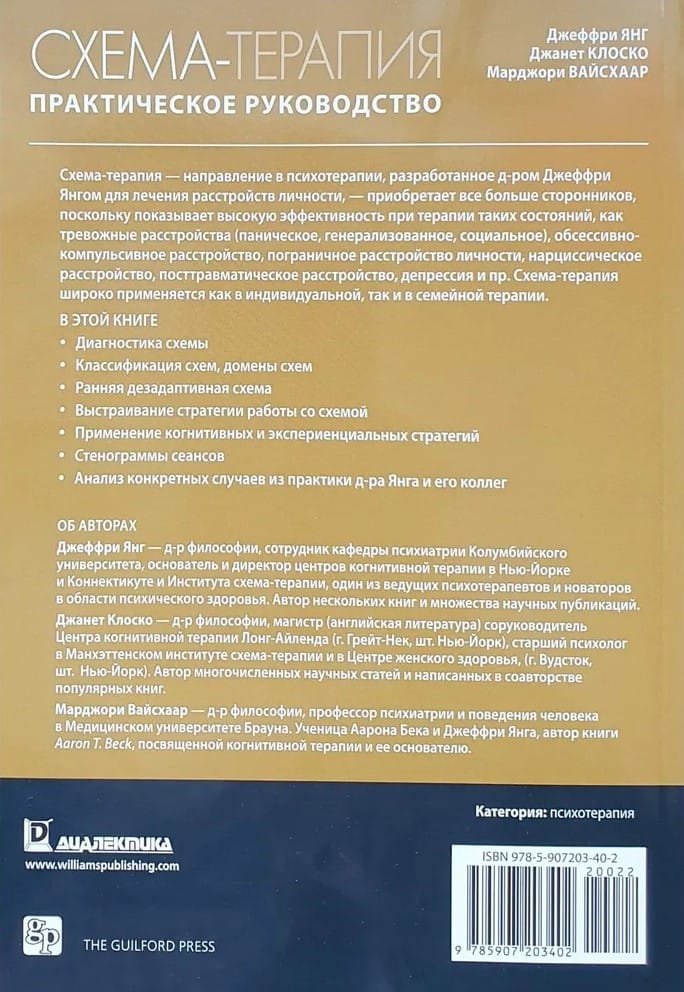 Схема-терапия — направление в психотерапии, разработанное д-ром Джеффри Янгом для лечения расстройств личности, — приобретает все больше сторонников, поскольку показывает высокую эффективность при терапии таких состояний, как тревожные расстройства (паническое, генерализованное, социальное), обсессивно-компульсивное расстройство, пограничное расстройство личности, нарциссическое расстройство, посттравматическое расстройство, депрессия и пр. Схема-терапия широко применяется как в индивидуальной, так и в семейной терапии. В этой книге: • диагностика схемы; • классификация схем, домены схем; • ранняя дезадаптивная схема; • выстраивание стратегии работы со схемой; • применение когнитивных и экспериенциальных стратегий; • стенограммы сеансов; • анализ конкретных случаев из практики д-ра Янга и его коллег.