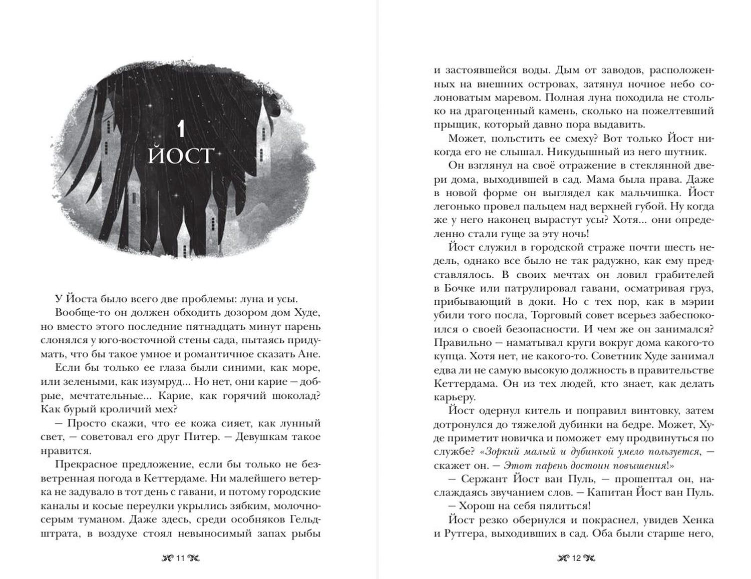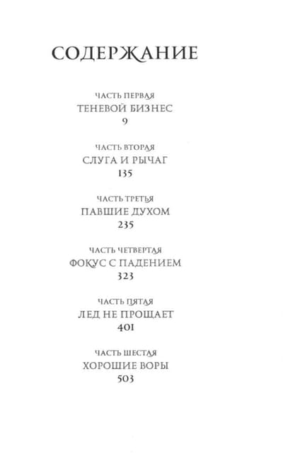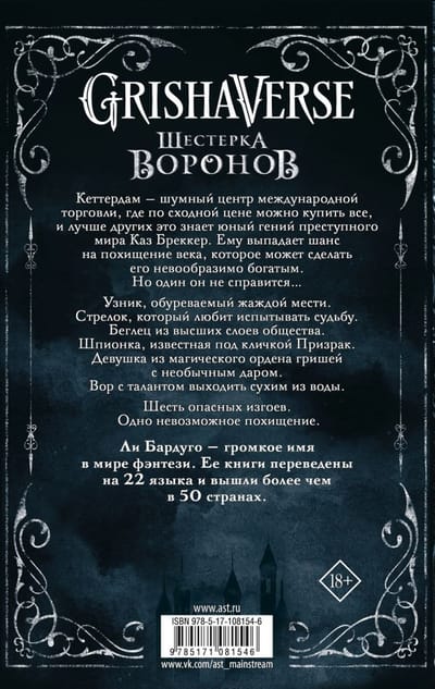 Каз Бреккер никогда не снимает черных перчаток. Но, если не хочешь стать ужином для акул, не спрашивай его, почему. Никому не известно, где его семья, откуда он пришел и почему остался в Кеттердаме. Зато он знает обо всех и все. Бреккер — правая рука главаря одной из самых влиятельных банд в городе. Казино, бордели, нелегальная торговля — его стихия. А еще шантаж, грабеж и, если понадобится, хладнокровное убийство. Но все это мелочи по сравнению с новым заказом. На кону — баснословные деньги и… секрет, который может уничтожить одни народы и возвеличить другие. Какие именно — теперь зависит от Каза и его команды. Шестерых «воронов», которым нечего терять кроме надежды. Это дело объединит их. Лучшего стрелка банды Отбросов и новичка, который не умеет держать пистолет в руках. Соблазнительную чародейку, умеющую с помощью магии взрывать сердца, и безжалостного охотника на таких, как она. Юную гимнастку из самого известного публичного дома во всей Керчии и Каза Бреккера, способного без тени сомнения вырвать глаз предателю. Им предстоит один путь, но у каждого своя цель…