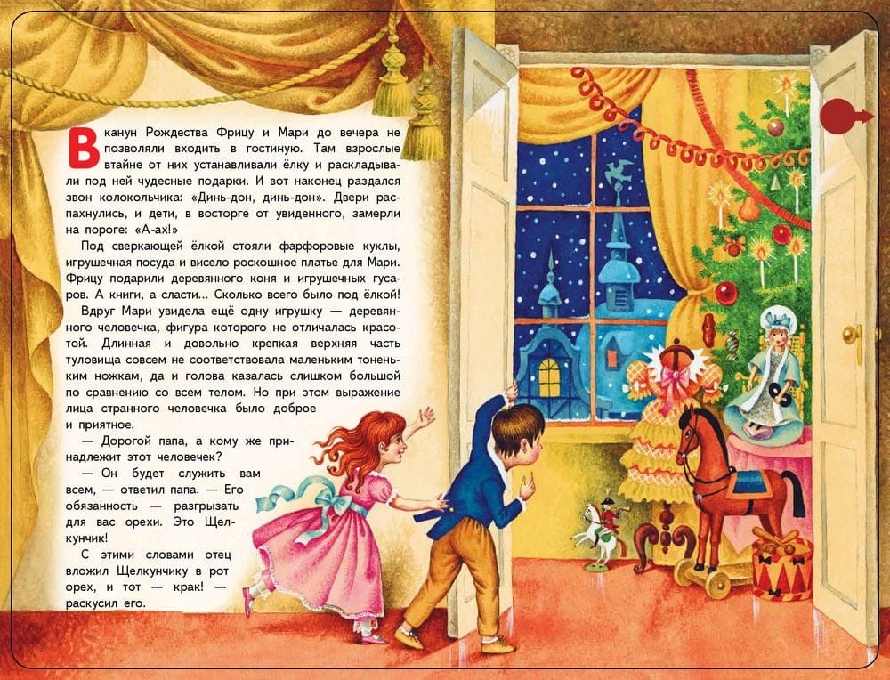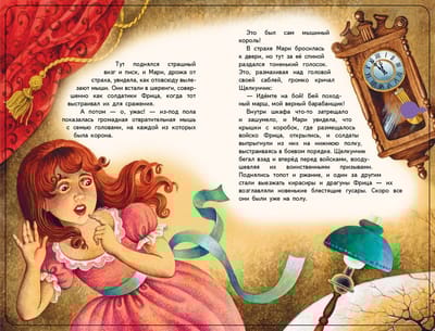Всё самое чудесное и невероятное происходит в канун Рождества. И именно в это время происходит самая сказочная в жизни девочки Мари встреча. Встреча не с простым Щелкунчиком, разгрызающим орехи, а с заколдованным принцем. Конечно, добрая и отзывчивая Мари поможет избавиться от заклятия. Музыкальная книга-аудиоспектакль расскажет любимую сказку и станет прекрасным подарком ребёнку. Текст сказки адаптирован для детей от 2 до 5 лет. Издание выполнено в большом формате, украшено цветной фольгой. Каждая страница — из плотного картона. 10 кнопок, два режима проигрывания аудиоспектакля. Музыкальный модуль работает от двух батареек типа ААА.