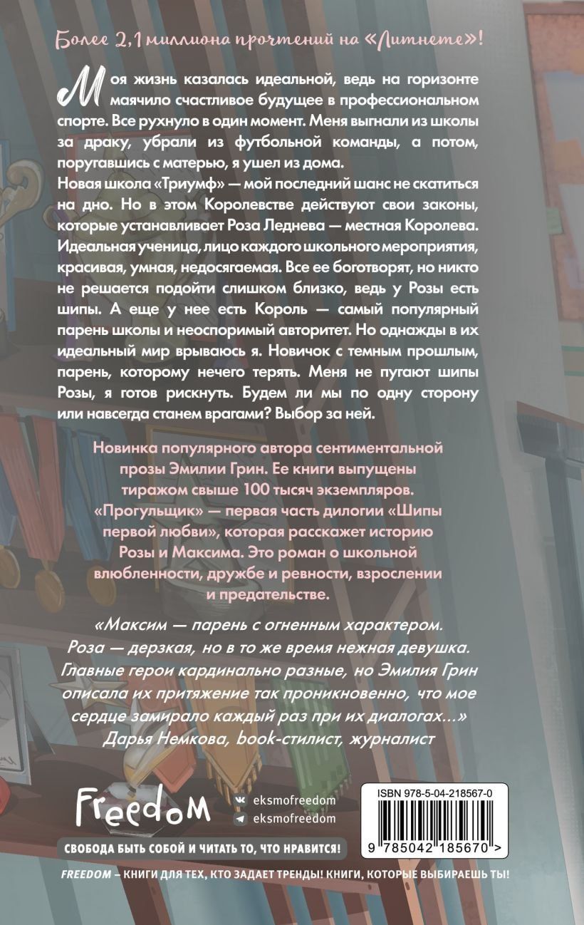 «Прогульщик» — первая часть дилогии «Шипы первой любви», которая расскажет историю Розы и Максима. Внутри атмосферная верстка, две сюжетных черно-белых иллюстрации, и только в первом тираже в подарок открытка!