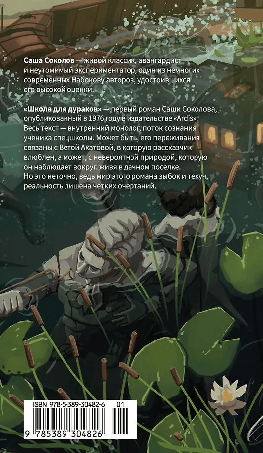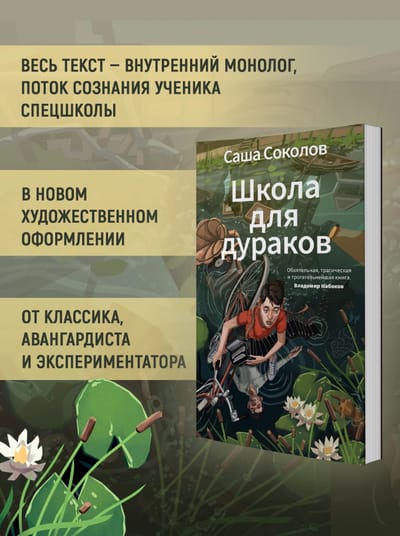 «Школа для дураков» — первый роман Саши Соколова, опубликованный в 1976 году в издательстве Ardis. Весь текст — внутренний монолог, поток сознания ученика спецшколы. Может быть, его переживания связаны с Ветой Акатовой, в которую рассказчик влюблен, а может, с невероятной природой, которую он наблюдает вокруг, живя в дачном поселке. Но это неточно, ведь мир этого романа зыбок и текуч, реальность лишена четких очертаний. По определению самого автора, это книга «об утонченном и странном мальчике, страдающем раздвоением личности… который не может примириться с окружающей действительностью» и, приобщаясь к миру взрослых, открывает в нем присутствие любви и смерти.