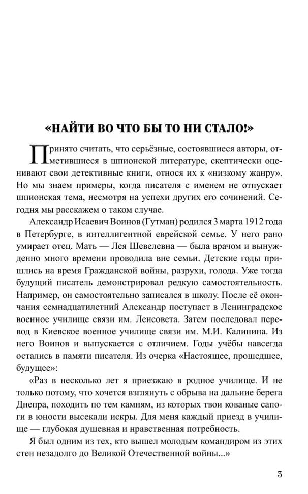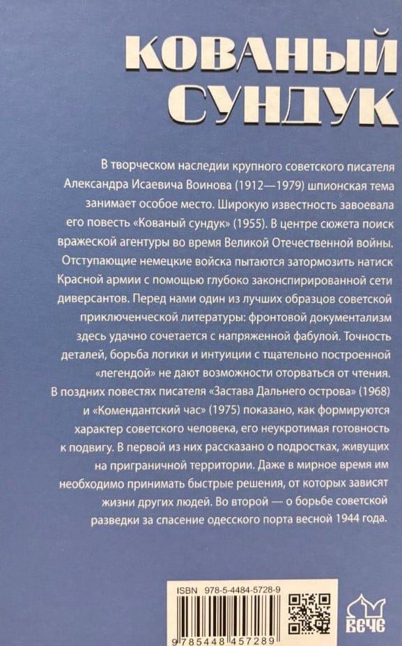 В творческом наследии крупного советского писателя Александра Исаевича Воинова (1912—1979) шпионская тема занимает особое место. Широкую известность завоевала его повесть «Кованый сундук» (1955). В центре сюжета поиск вражеской агентуры во время Великой Отечественной войны. Отступающие немецкие войска пытаются затормозить натиск Красной армии с помощью глубоко законспирированной сети диверсантов. Перед нами один из лучших образцов советской приключенческой литературы: фронтовой документализм здесь удачно сочетается с напряженной фабулой. Точность деталей, борьба логики и интуиции с тщательно построенной «легендой» не дают возможности оторваться от чтения. В поздних повестях писателя «Застава Дальнего острова» (1968) и «Комендантский час» (1975) показано, как формируются характер советского человека, его неукротимая готовность к подвигу. В первой из них рассказано о подростках, живущих на приграничной территории. Даже в мирное время им необходимо принимать быстрые решения, от которых зависят жизни других людей. Во второй — о борьбе советской разведки за спасение одесского порта весной 1944 года.