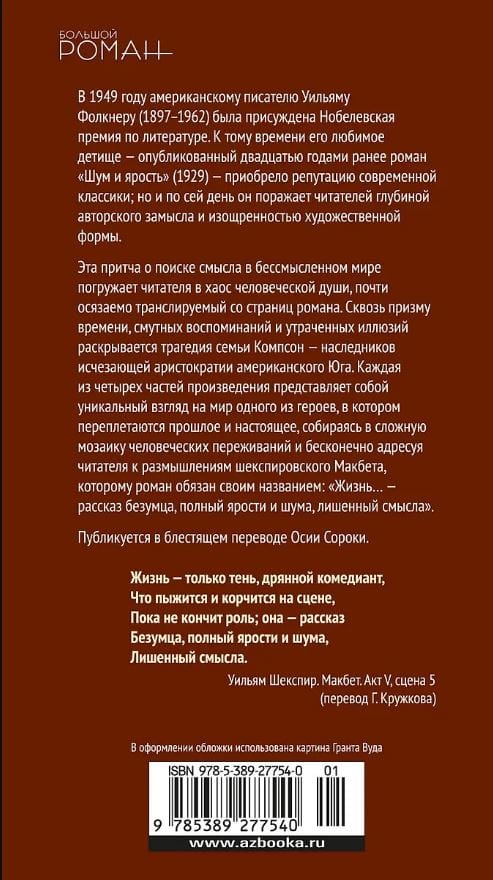 Эта притча о поиске смысла в бессмысленном мире погружает читателя в хаос человеческой души, почти осязаемо транслируемый со страниц романа. Сквозь призму времени, смутных воспоминаний и утраченных иллюзий раскрывается трагедия семьи Компсон — наследников исчезающей аристократии американского Юга. Каждая из четырех частей произведения представляет собой уникальный взгляд на мир одного из героев, в котором переплетаются прошлое и настоящее, собираясь в сложную мозаику человеческих переживаний и бесконечно адресуя читателя к размышлениям шекспировского Макбета, которому роман обязан своим названием: «Жизнь... — рассказ безумца, полный ярости и шума, лишенный смысла».