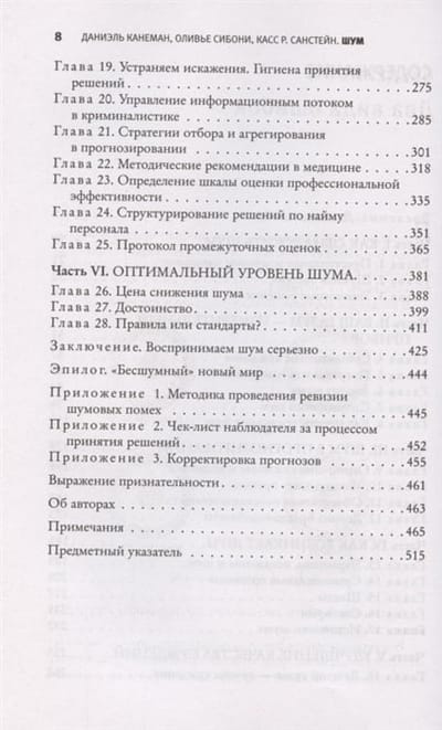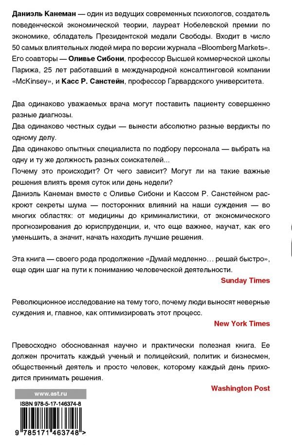 Два одинаково уважаемых врача могут поставить пациенту совершенно разные диагнозы. Два одинаково честных судьи — вынести абсолютно разные вердикты по одному делу. Два одинаково опытных специалиста по подбору персонала — выбрать на одну и ту же должность разных соискателей... Почему это происходит? От чего зависит? Могут ли на такие важные решения влиять время суток или день недели? Даниэль Канеман вместе с Оливье Сибони и Кассом Р. Санстейном раскроют секреты шума — посторонних влияний на наши суждения — во многих областях: от медицины до криминалистики, от экономического прогнозирования до юриспруденции, и, что еще важнее, научат, как его уменьшить, а значит, начать находить лучшие решения.