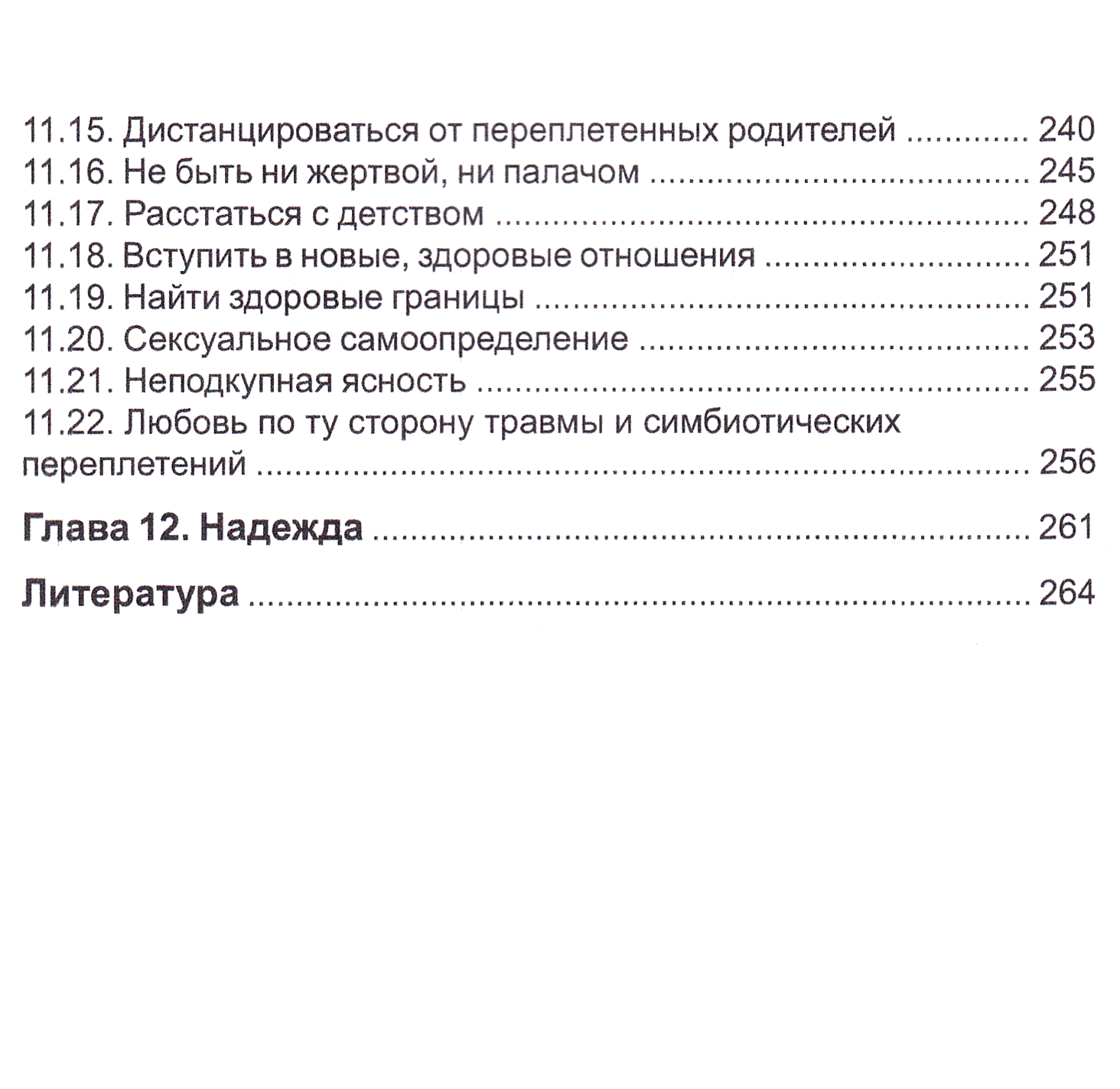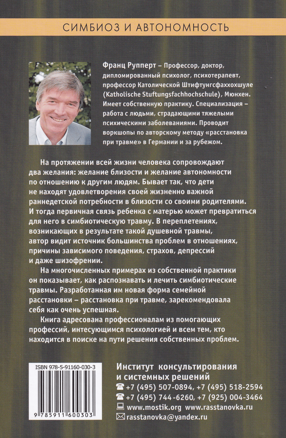 На протяжении всей жизни человека сопровождают два желания: желание близости и желание автономности по отношению к другим людям. Бывает так, что дети не находят удовлетворения своей жизненно важной раннедетской потребности в близости со своими родителями. И тогда первичная связь ребенка с матерью может превратиться для него в симбиотическую травму. В переплетениях, возникающих в результате такой душевной травмы, автор видит источник большинства проблем в отношениях, причины зависимого поведения, страхов, депрессий и даже шизофрении. На многочисленных примерах из собственной практики он показывает, как распознавать и лечить симбиотические травмы. Разработанная им новая форма семейной расстановки - расстановка при травме, зарекомендовала себя как очень успешная.