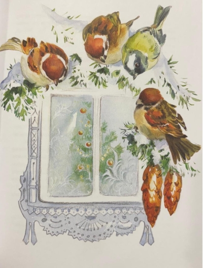 Однажды ночью молодая синичка Зинька, которая ночевала в воробьином гнезде над окошком дома, проснулась от сильного шума. Она заглянула в окно и увидела большую украшенную ёлку и весёлых детей вокруг. А утром воробьи рассказали Зиньке про Новый год и двенадцать месяцев…