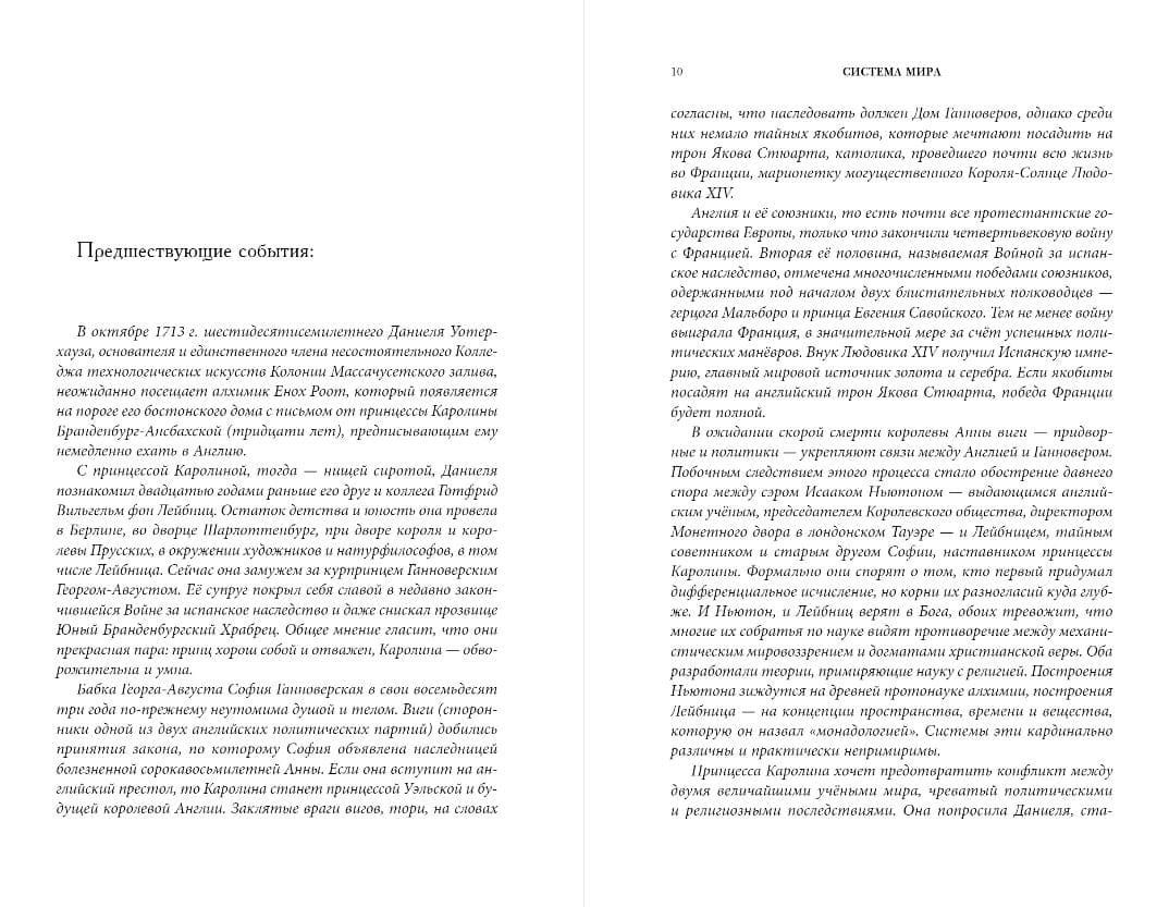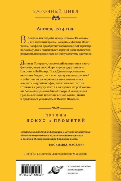 В 1714 году, когда Даниель Уотерхауз без особого триумфа возвращается на берега Англии, мир выглядит опасным — особенно в Лондоне, центре финансов, инноваций и заговоров. Стареющий пуританин и натурфилософ, в прошлом доверенное лицо высокопоставленных лиц и современник самых блестящих умов эпохи, отважился преодолеть океан, чтобы помочь решить конфликт между двумя враждующими гениями. И пусть на первой взгляд многое изменилось, лицемерие и жестокость, от которых Даниель когда-то бежал в североамериканские колонии, по-прежнему являются разменной монетой Британской короны.