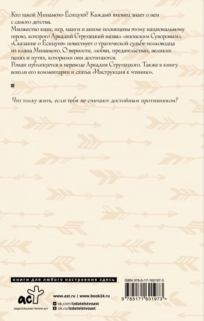 Множество книг, игр, манги и аниме посвящены этому национальному герою, которого Аркадий Стругацкий назвал «японским Суворовым». «Сказание о Ёсицунэ» повествует о трагической судьбе полководца из клана Минамото. О верности, любви, предательствах, великих целях и путях, которыми они достигаются. Роман публикуется в переводе Аркадия Стругацкого. Также в книгу вошли его комментарии и статья «Инструкция к чтению».