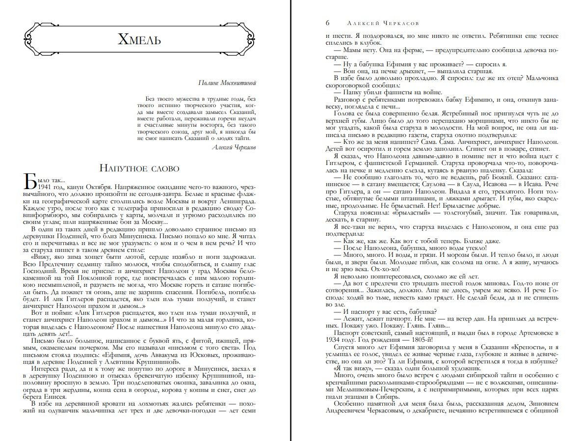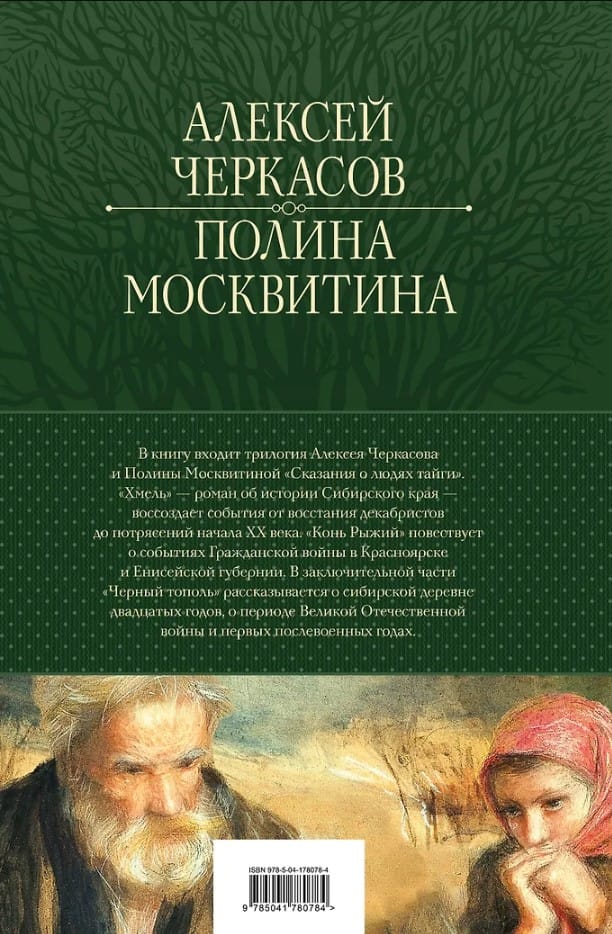 В книгу входит трилогия Алексея Черкасова и Полины Москвитиной «Сказания о людях тайги». «Хмель» — роман об истории Сибирского края, воссоздает события от восстания декабристов до потрясений начала XX века. «Конь рыжий» повествует о событиях Гражданской войны в Красноярске и Енисейской губернии. В заключительной части «Черный тополь» рассказывается о сибирской деревне двадцатых годов, о периоде Великой Отечественной войны и первых послевоенных годах.