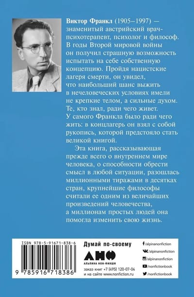 Эта удивительная книга сделала ее автора одним из величайших духовных учителей человечества в XX веке. В ней философ и психолог Виктор Франкл, прошедший нацистские лагеря смерти, открыл миллионам людей всего мира путь постижения смысла жизни. В страшных, убийственных условиях концлагерей он показал необычайную силу человеческого духа. Дух упрям, вопреки слабости тела и разладу души. Человеку есть ради чего жить!