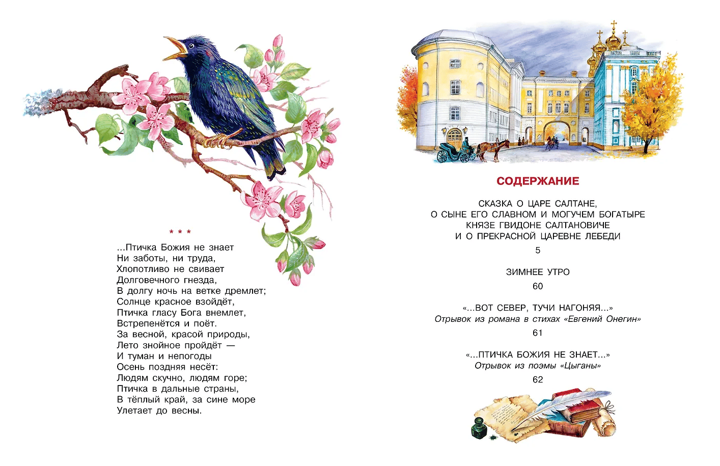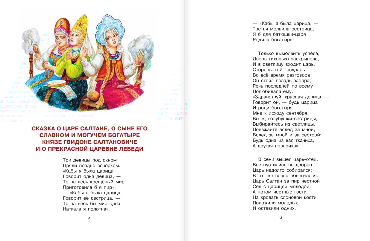 Сказки А. С. Пушкина — волшебные, напевные, почти народные. И это не случайно. Ведь именно из народных сказок и преданий великий поэт черпал вдохновение. «Сказка о царе Салтане» именно такая. Написанная в 1831 году, она по-прежнему остаётся одной из самых читаемых у А. С. Пушкина. Также в книге представлены несколько стихотворений поэта.