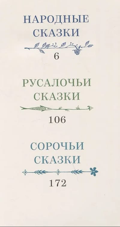 В книгу вошли русские народные сказки в обработке Толстого, а также сказочные новеллы, созданные писателем на основе славянской мифологии и объединённые им самим в сборники: «Русалочьи сказки» — с волшебно-мифологическими сюжетами, «Сорочьи сказки» — о животных.