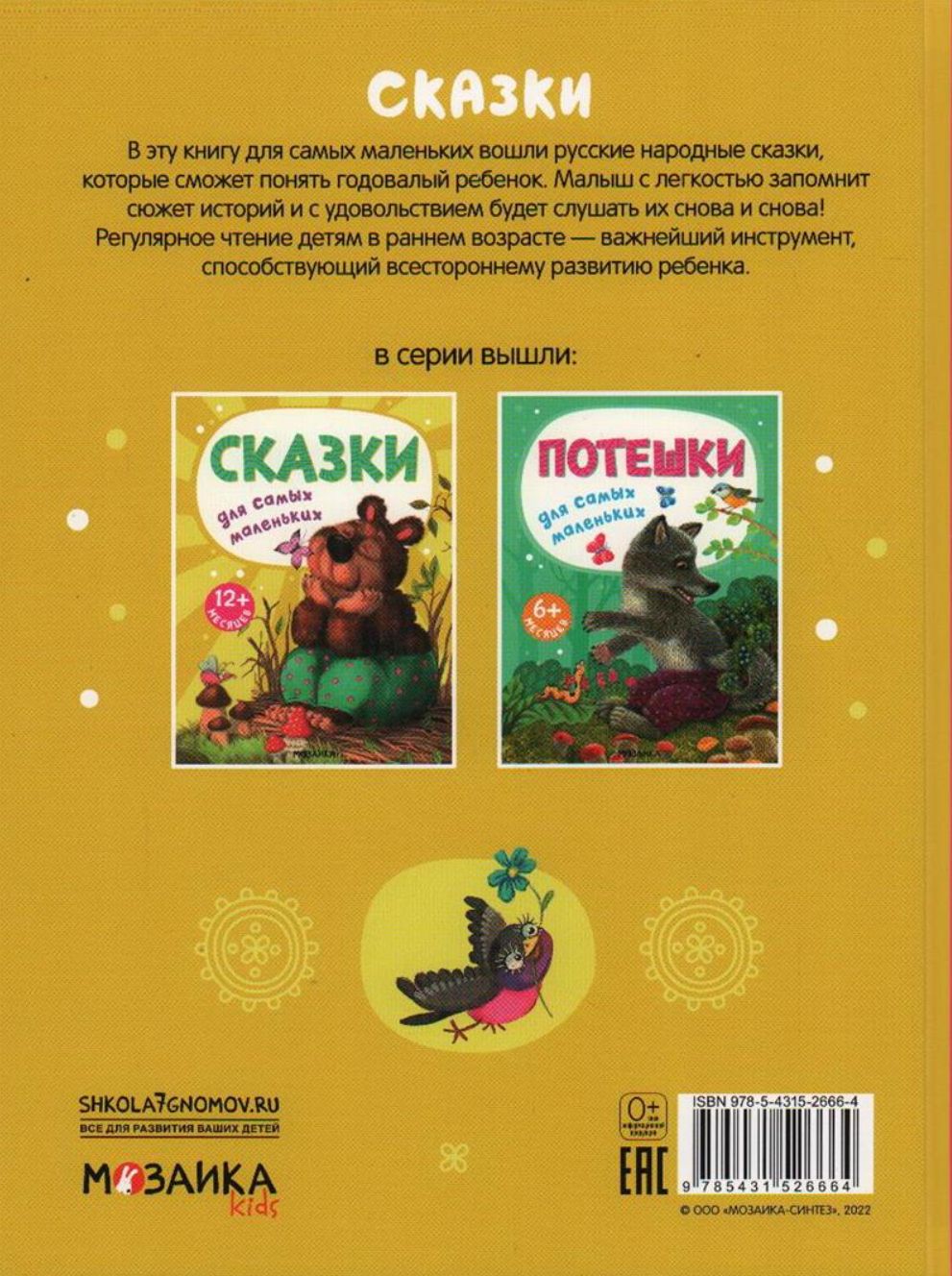 В сборник сказок для самых маленьких вошли истории, которые сможет понять годовалый ребёнок. Малыш с легкостью запомнит сюжет сказок и с удовольствием будет слушать их снова и снова! Регулярное чтение детям в раннем возрасте — важнейший инструмент, способствующий всестороннему развитию ребёнка.