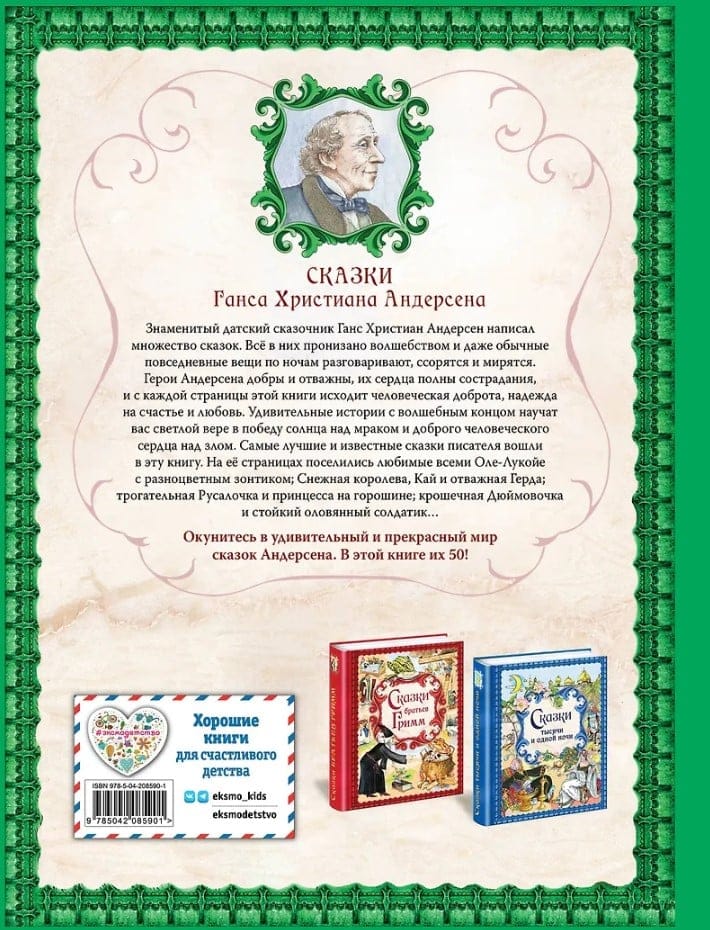 Красочные страницы раскрываются перед читателями, словно волшебный зонтик Оле-Лукойе, и мы понимаем: никто на свете не знает столько сказок, сколько знает их Ганс Христиан Андерсен. Созданные им образы знакомы с давних пор детям всего мира: холодно-бесстрастная Снежная королева, отважная и верная Герда, преданная Русалочка, трогательный Гадкий утёнок... Но в этой чудесной книге среди 50 сказок вы непременно найдёте ту, которую ещё не читали. И эта встреча обязательно станет для вас незабываемой.