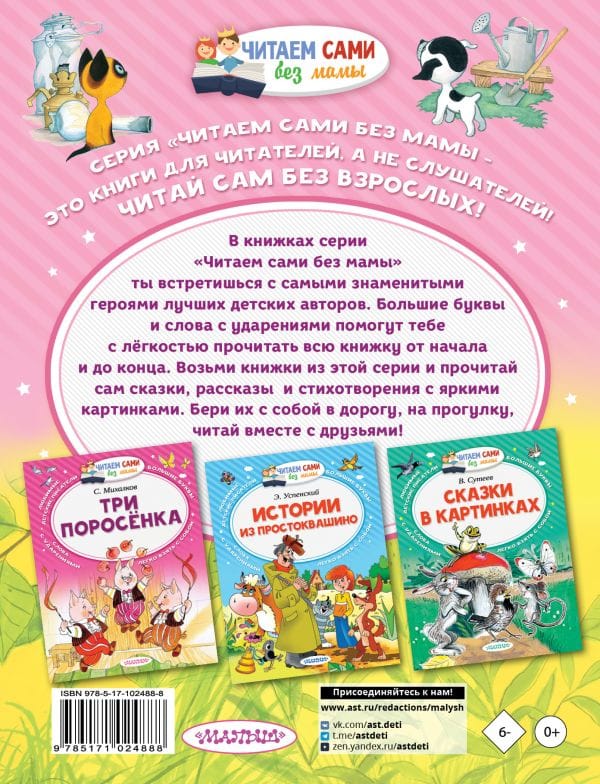 В книгу «Сказки про зверят» вошли небольшие сказки лучших отечественных авторов - С. Маршака, В. Сутеева, В. Бианки и других. Ребята самостоятельно прочитают историю о глупом мышонке, познакомятся с Гусем, который от глупости и зависти превратился в неизвестную птицу, вместе с котёнком Гавом попробуют разыскать неприятности, поищут вместе с Мухой лишние хвосты у зверей и узнают, какое животное лучше всего подходит на роль кукушки в часах. В книжке «Сказки про зверят» большие буквы, слова с ударениями и много цветных иллюстраций. Книжки серии «Читаем сами без мамы» можно взять с собой в дорогу, на прогулку и читать вместе с друзьями!