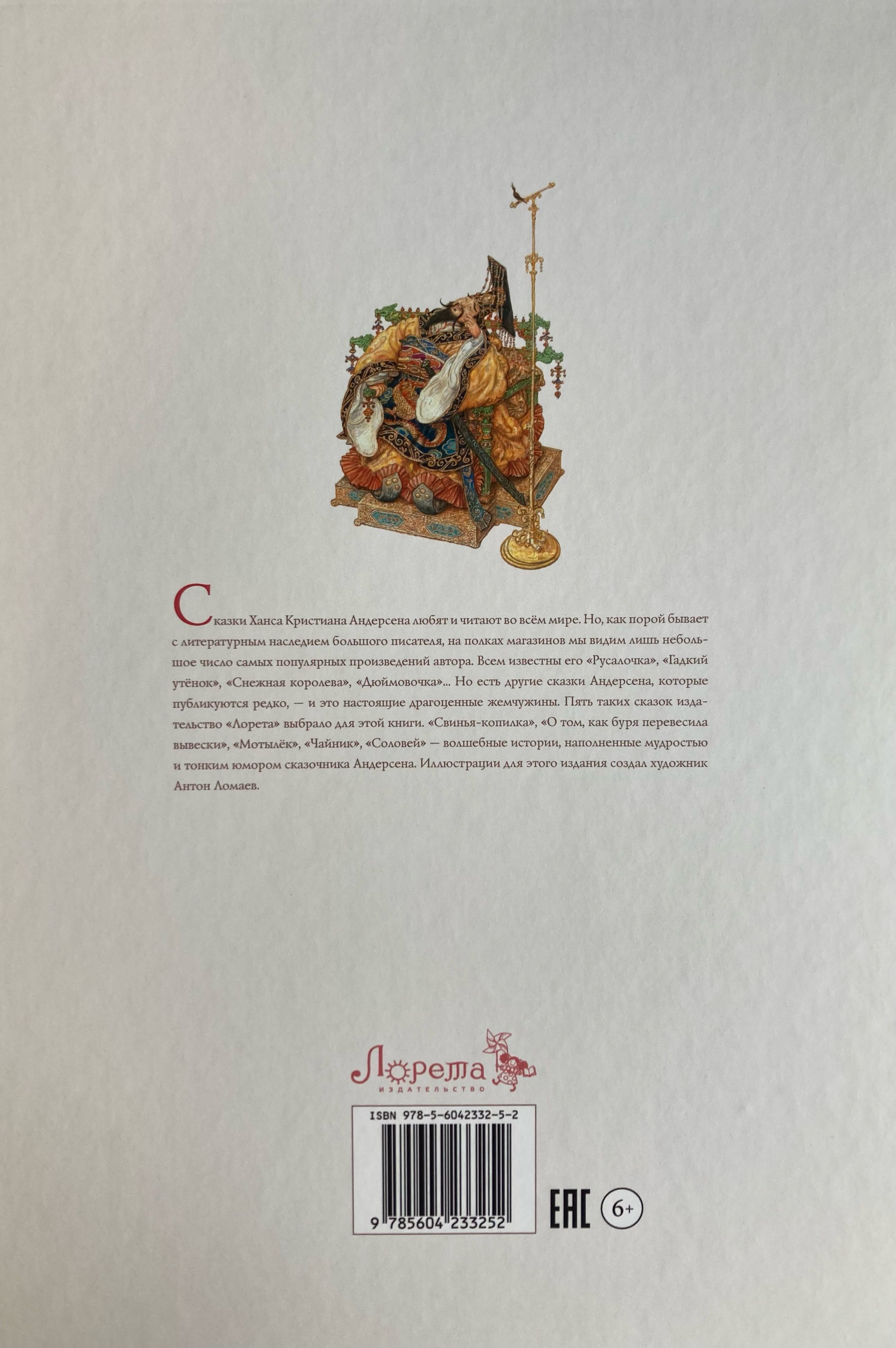 Сказки Ханса Кристиана Андерсена любят и читают во всем мире. Но, как порой бывает с литературным наследием большого писателя, на полках магазинов мы видим лишь небольшое число самых популярных произведений автора. Всем известны его «Русалочка», «Гадкий утенок», «Снежная королева», «Дюймовочка»... Но есть и другие сказки Андерсена, которые публикуются редко — и это настоящие драгоценные жемчужины. Пять таких сказок издательство «Лорета» выбрало для этой замечательной книги. «Свинья-копилка», «О том, как буря перевесила вывески», «Мотылек», «Чайник», «Соловей» — волшебные истории наполненные мудростью и тонким юмором сказочника Андерсена. Иллюстрации для этого издания создал художник Антон Ломаев.
