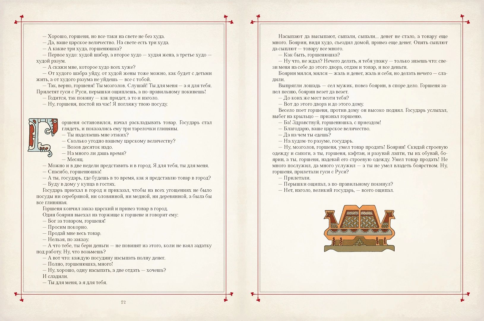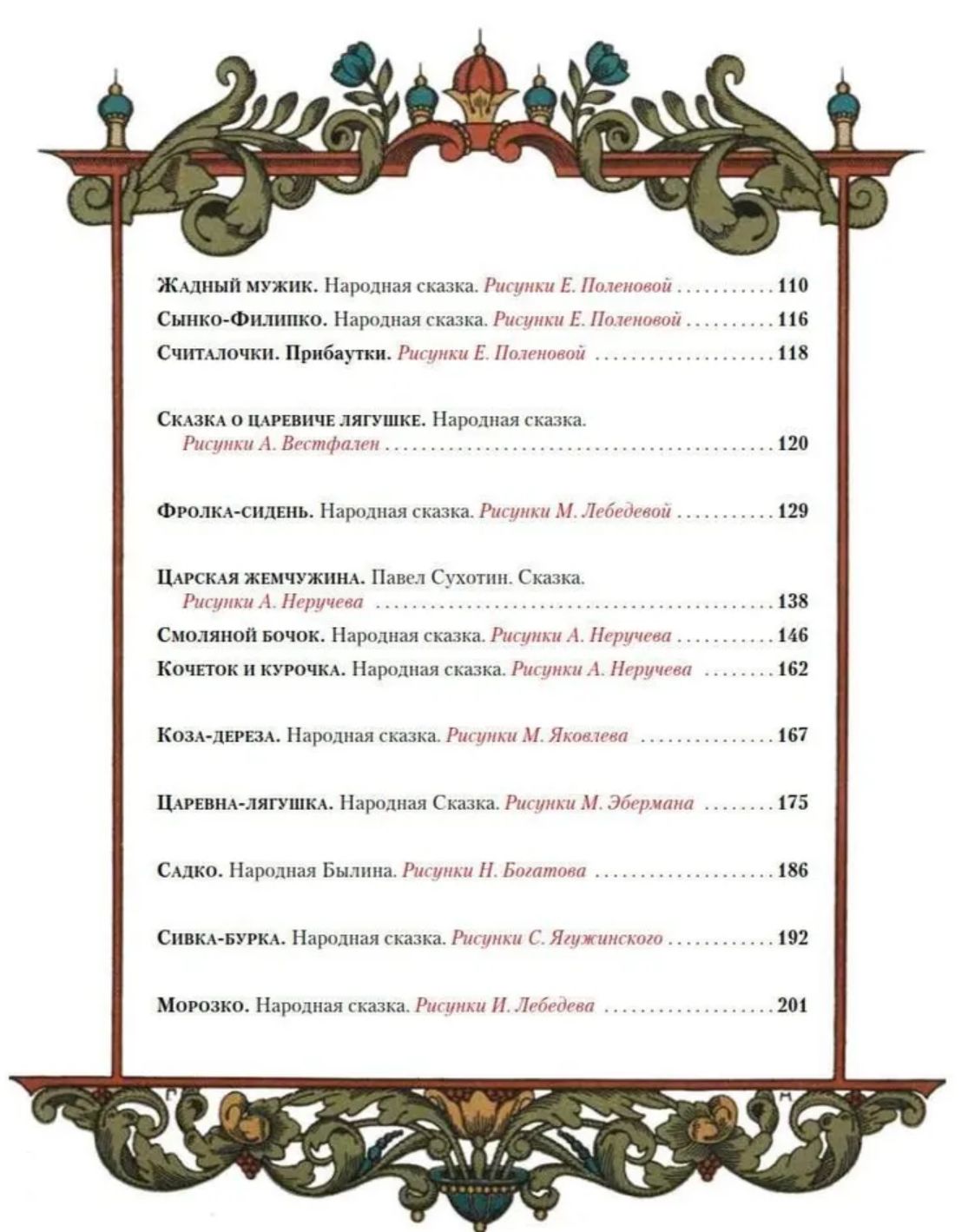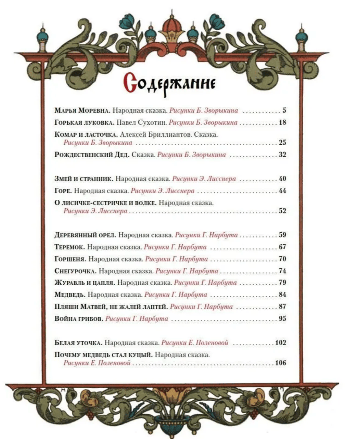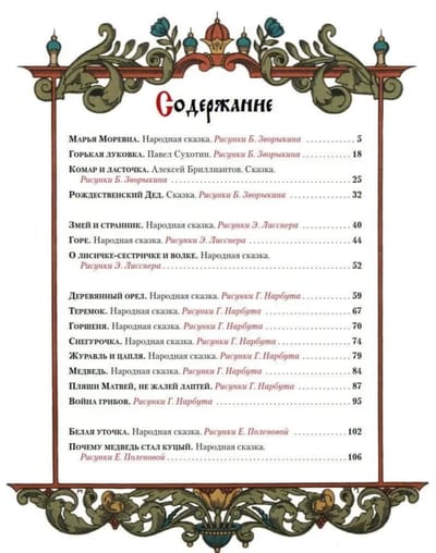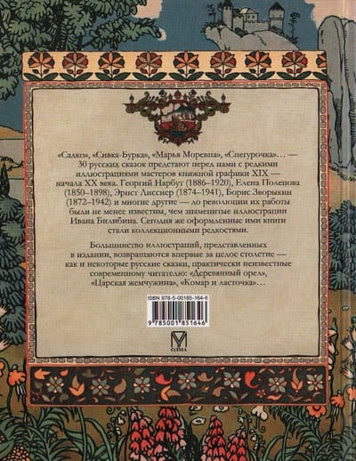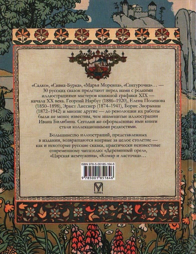 «Садко», «Сивка-Бурка», «Марья Моревна», «Снегурочка»... - 30 русских сказок предстают перед нами с редкими иллюстрациями мастеров книжной графики XIX - начала XX века. Георгий Нарбут (1886-1920), Елена Поленова (1850-1898), Эрнст Лисснер (1874-1941), Борис Зворыкин (1872-1942) и многие другие - до революции их работы были не менее известны, чем знаменитые иллюстрации Ивана Билибина. Сегодня же оформленные ими книги стали коллекционными редкостями. Большинство иллюстраций, представленных в издании, возвращаются впервые за целое столетие - как и некоторые русские сказки, практически неизвестные современному читателю: «Деревянный орел», «Царская жемчужина», «Комар и ласточка»...
