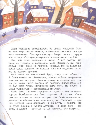 Саша Макарова любит придумывать невероятные истории, хотя школьная подруга смеётся над её фантазиями и называет вруньей. Но разве в новогоднюю ночь не происходят удивительные события? Встреча со старушкой, оказавшейся на самом деле Матушкой Зимой, научила девочку, что настоящие чудеса случаются лишь тогда, когда ты делаешь их не только для себя, но и для того, кому сейчас плохо.