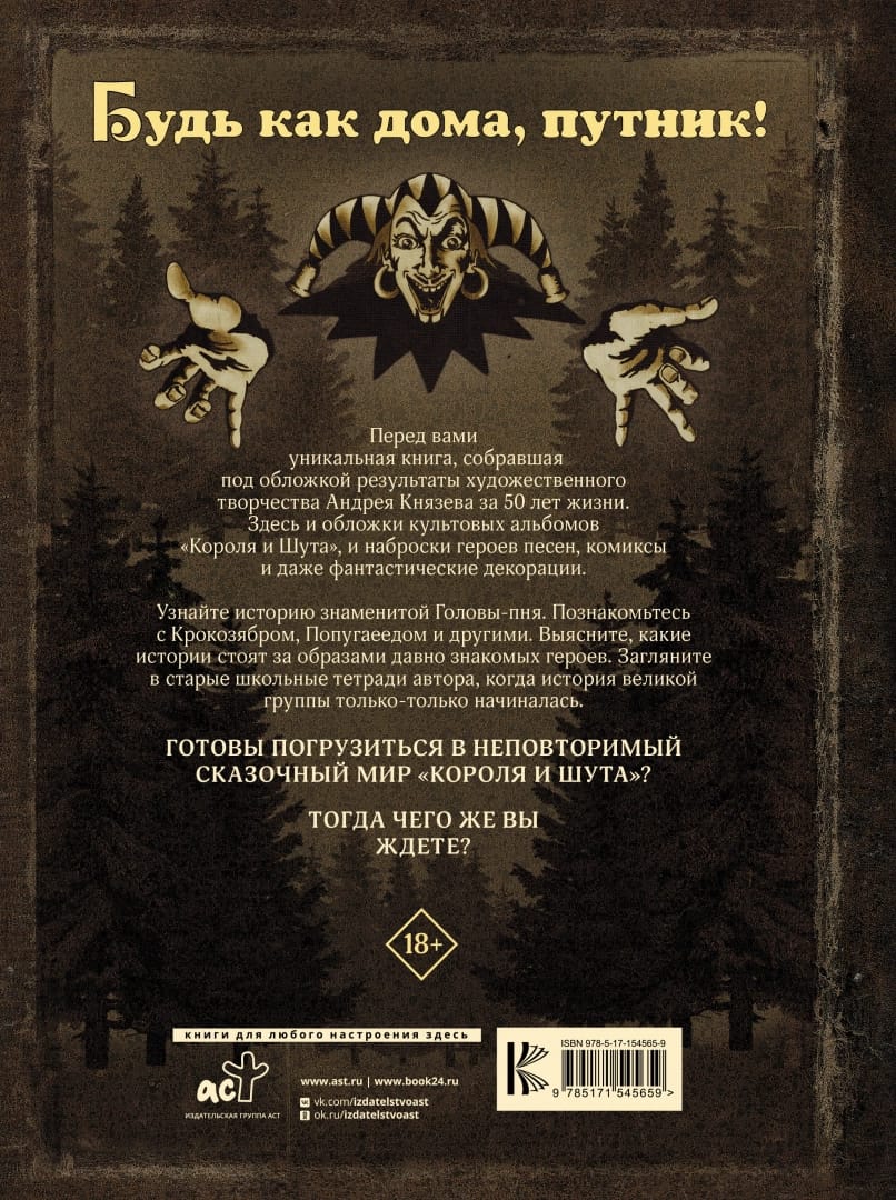 Андрей Князев - участник и один из основателей «Короля и Шута», лидер рок-группы «КняZz», бессменный оформитель альбомов и автор большинства текстов песен обоих коллективов. Его всегда знали, как музыканта, но есть и другая сфера искусства, в которой Андрей творил даже больше и дольше - живопись.   Перед вами уникальная книга, собравшая под обложкой результаты художественного творчества Андрея Князева за 50 лет жизни. Здесь вы найдете не только обложки культовых альбомов «Короля и Шута» и «КняZz», но и наброски героев песен, пейзажи, комиксы и даже фантастические декорации. Узнайте историю знаменитой Головы-пня. Познакомьтесь с Крокозябром, Попугаеедом и другими. Выясните, какие истории стоят за образами давно знакомых героев. Загляните в старые школьные тетради автора, когда его путь в творчестве только-только начинался.Готовы погрузиться в неповторимый сказочный мир Шута? Тогда чего же вы ждете?