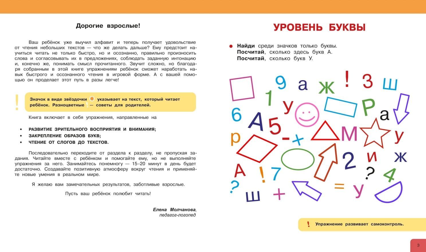 Книга включает в себя упражнения, направленные на развитие зрительных внимания, восприятия, уточнение, закрепление образов букв и чтение от слогов к текстам.