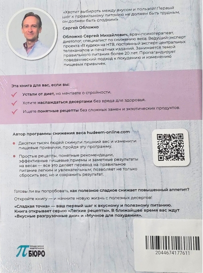Книга «Сладкая точка» психотерапевта и диетолога Сергея Обложко является частью программы по обучению правильному питанию и модификации пищевого поведения. Издание отталкивается от многолетнего опыта проведения программ. Первая книга из серии «Легкие рецепты» — пошаговое руководство по приготовлению полезного сладкого — охватывает основные типы десертов.