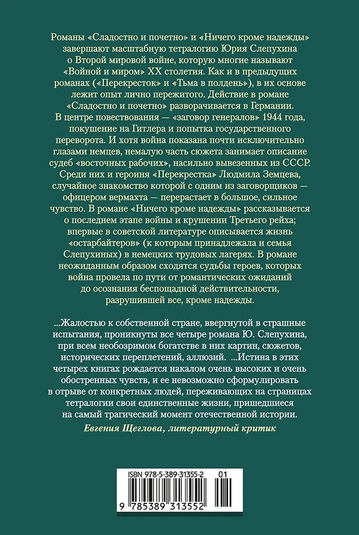 Романы «Сладостно и почетно» и «Ничего кроме надежды» завершают масштабную тетралогию Юрия Слепухина о Второй мировой войне, которую многие называют «Войной и миром» XX столетия. Как и в предыдущих романах («Перекресток» и «Тьма в полдень»), в их основе лежит опыт лично пережитого. Действие в романе «Сладостно и почетно» разворачивается в Германии. В центре повествования — «заговор генералов» 1944 года, покушение на Гитлера и попытка государственного переворота. И хотя война показана почти исключительно глазами немцев, немалую часть сюжета занимает описание судеб «восточных рабочих», насильно вывезенных из СССР. Среди них и героиня «Перекрестка» Людмила Земцева, случайное знакомство которой с одним из заговорщиков — офицером вермахта — перерастает в большое, сильное чувство.