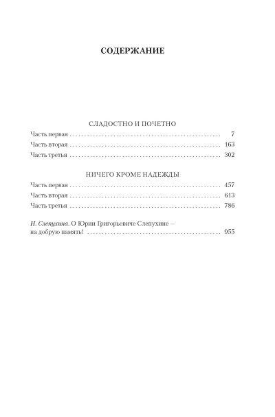 В романе «Ничего кроме надежды» рассказывается о последнем этапе войны и крушении Третьего рейха; впервые в советской литературе описывается жизнь «остарбайтеров» (к которым принадлежала и семья Слепухиных) в немецких трудовых лагерях. В романе неожиданным образом сходятся судьбы героев, которых война провела по пути от романтических ожиданий до осознания беспощадной действительности, разрушившей все, кроме надежды.