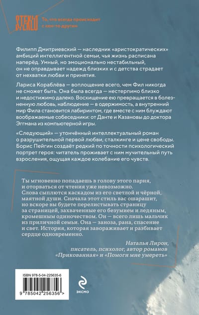 «Следующий» — утончённый интеллектуальный роман о разрушительной первой любви, сталкинге и цене свободы. Борис Пейгин создаёт редкий по точности психологический портрет героя: читатель проживает с ним мучительный путь взросления, ощущая каждое колебание его чувств.