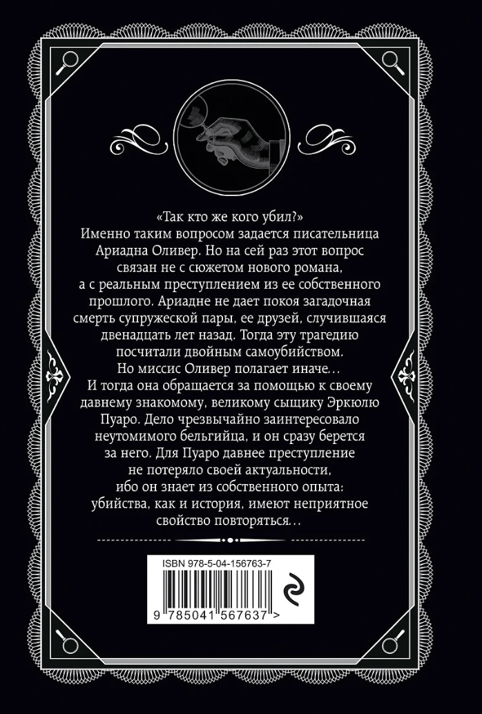 «Так кто же кого убил?» Именно таким вопросом задается писательница Ариадна Оливер. Но на сей раз этот вопрос связан не с сюжетом нового романа, а с реальным преступлением из ее собственного прошлого. Ариадне не дает покоя загадочная смерть супружеской пары, ее друзей, случившаяся двенадцать лет назад. Тогда эту трагедию посчитали двойным самоубийством. Но миссис Оливер полагает иначе… И тогда она обращается за помощью к своему давнему знакомому, великому сыщику Эркюлю Пуаро. Дело чрезвычайно заинтересовало неутомимого бельгийца, и он сразу берется него. Для Пуаро давнее преступление не потеряло своей актуальности, ибо он знает из собственного опыта: убийства, как и история, имеют неприятное свойство повторяться…