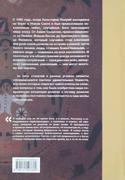 С 1492 года, когда Христофор Колумб высадился на берег в Новом Свете и был провозглашен посланником небес, случайные боги преследуют нашу эпоху. От Хайле Селассие, провозглашенного на Ямайке Живым Богом, до британского принца Филиппа, который случайно стал ключевой фигурой новой религии на острове в южной части Тихого океана, люди, ставшие божественными, — именно люди — появились на всех континентах. И поскольку эти обожествления всегда возникают в моменты потрясений — гражданских войн, имперских завоеваний, революций, — они могут многому нас научить.