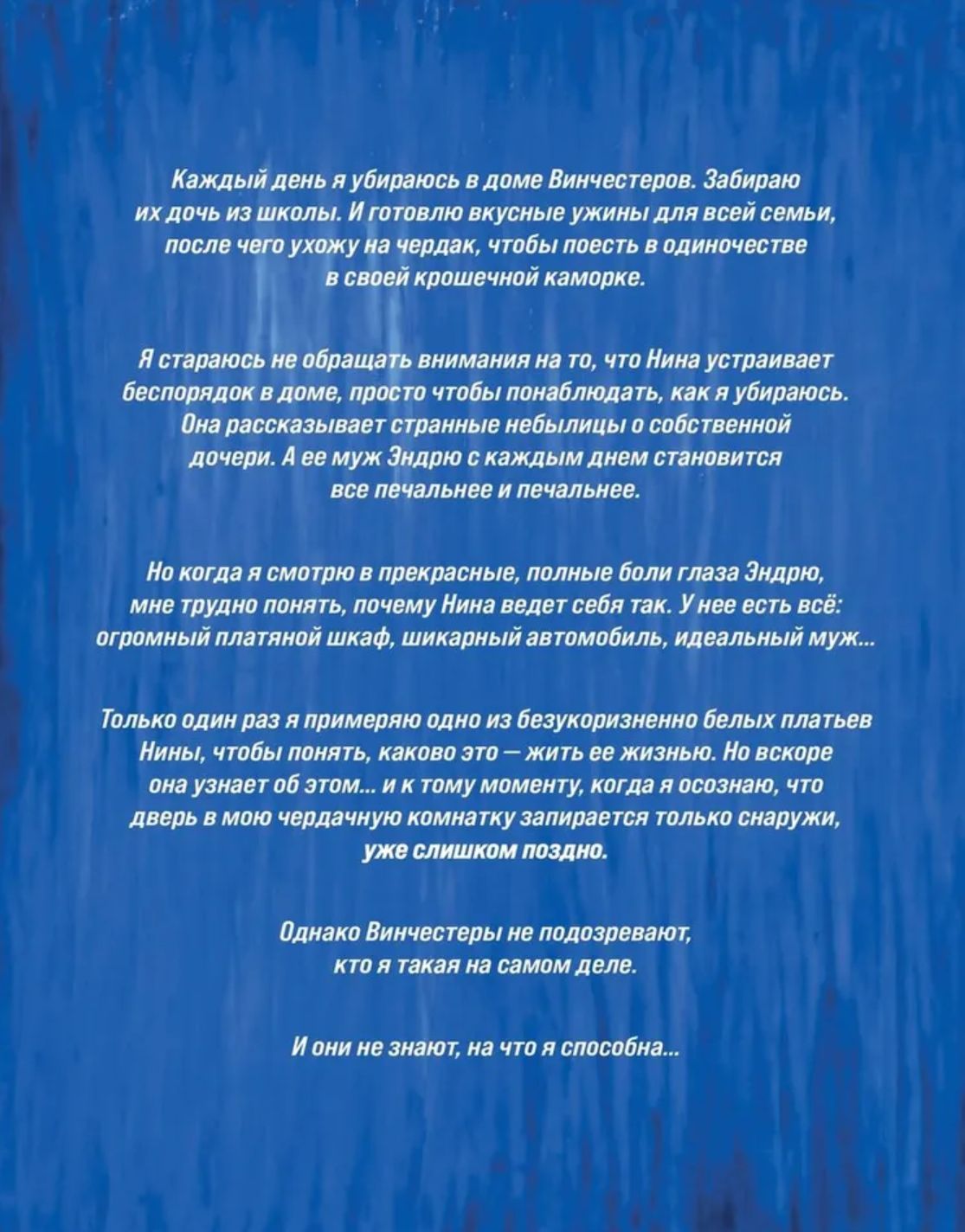 Я стараюсь не обращать внимания на то, что Нина устраивает беспорядок в доме, просто чтобы понаблюдать, как я убираюсь. Она рассказывает странные небылицы о собственной дочери. А ее муж Эндрю с каждым днем становится все печальнее и печальнее.