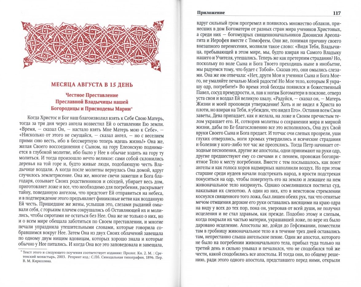 В сборнике представлены тексты службы Успения Пресвятыя Богородицы и похвалы на святое Ея преставление. В приложении печатаются поучения на день праздника из Пролога, слово святителя Андрея Критского, а также устав о Последовании на преставление Пресвятой Владычицы нашей Богородицы и Приснодевы Марии.