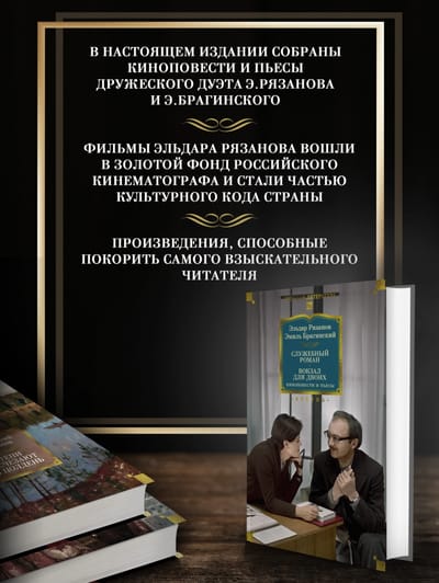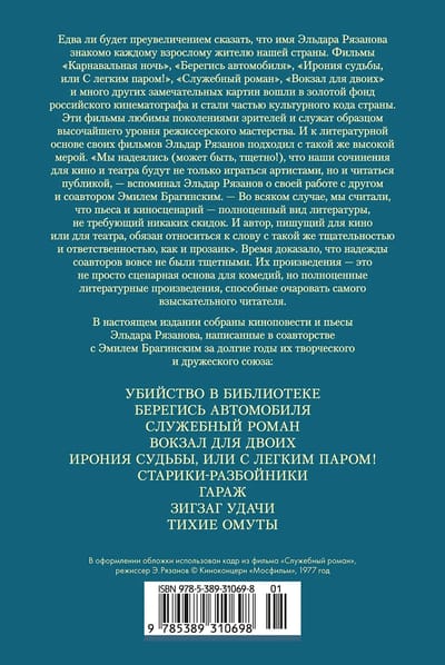 В настоящем издании собраны киноповести и пьесы Рязанова и Брагинского, созданные за долгие годы их творческого и дружеского союза: «Убийство в библиотеке», «Берегись автомобиля», «Служебный роман», «Вокзал для двоих», «Ирония судьбы, или С легким паром!», «Старики-разбойники», «Гараж», «Зигзаг удачи», «Тихие омуты».