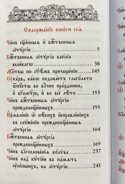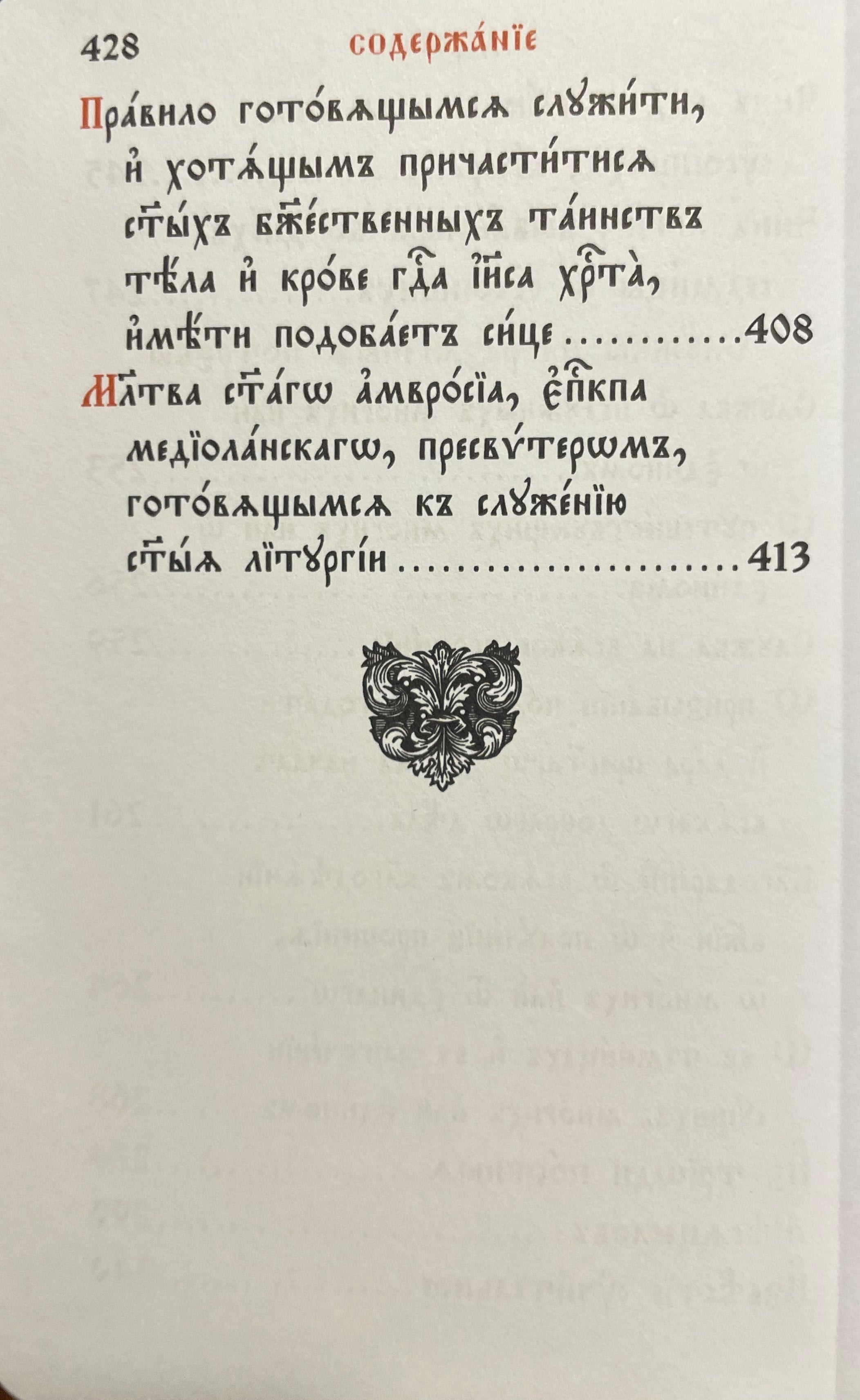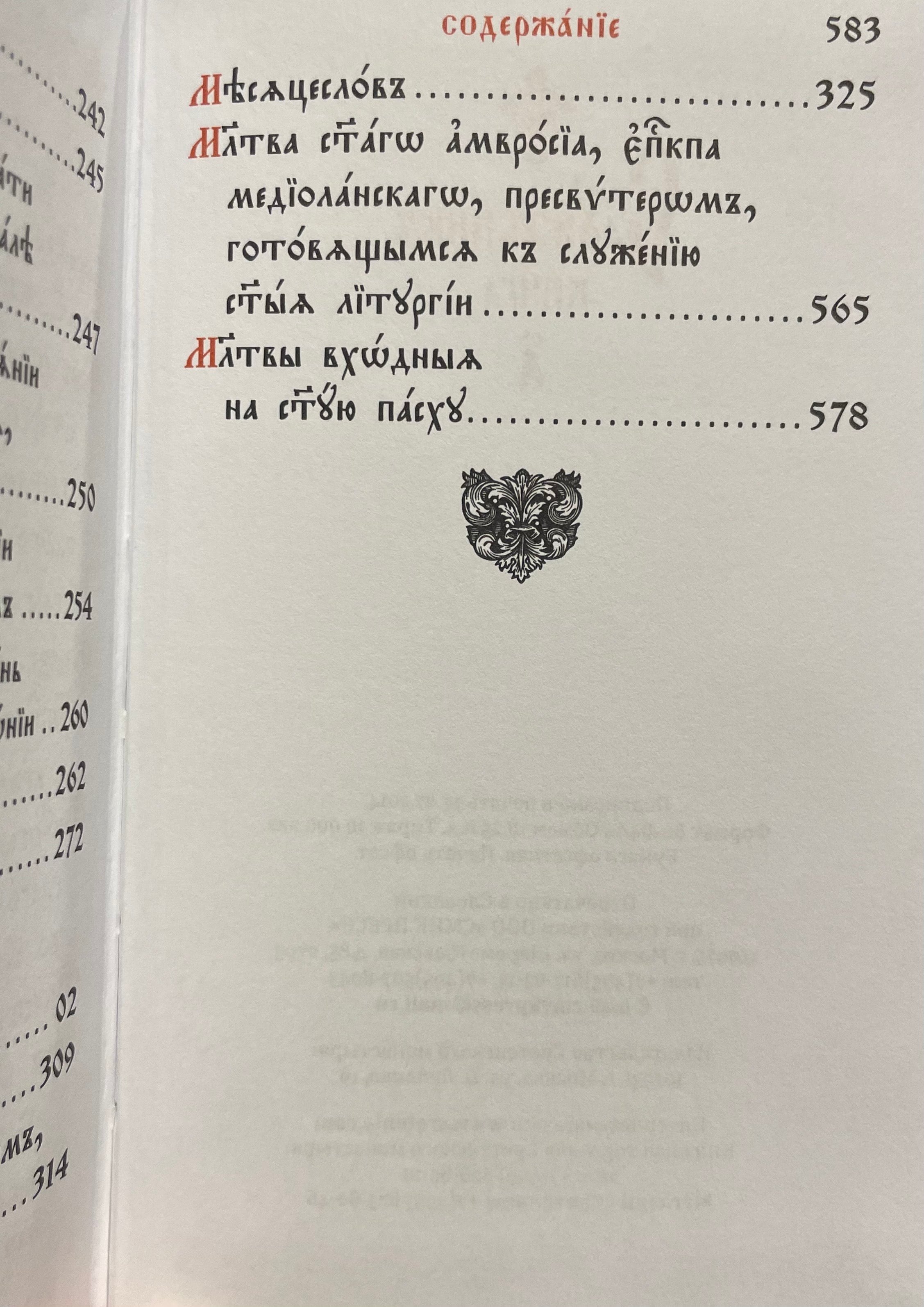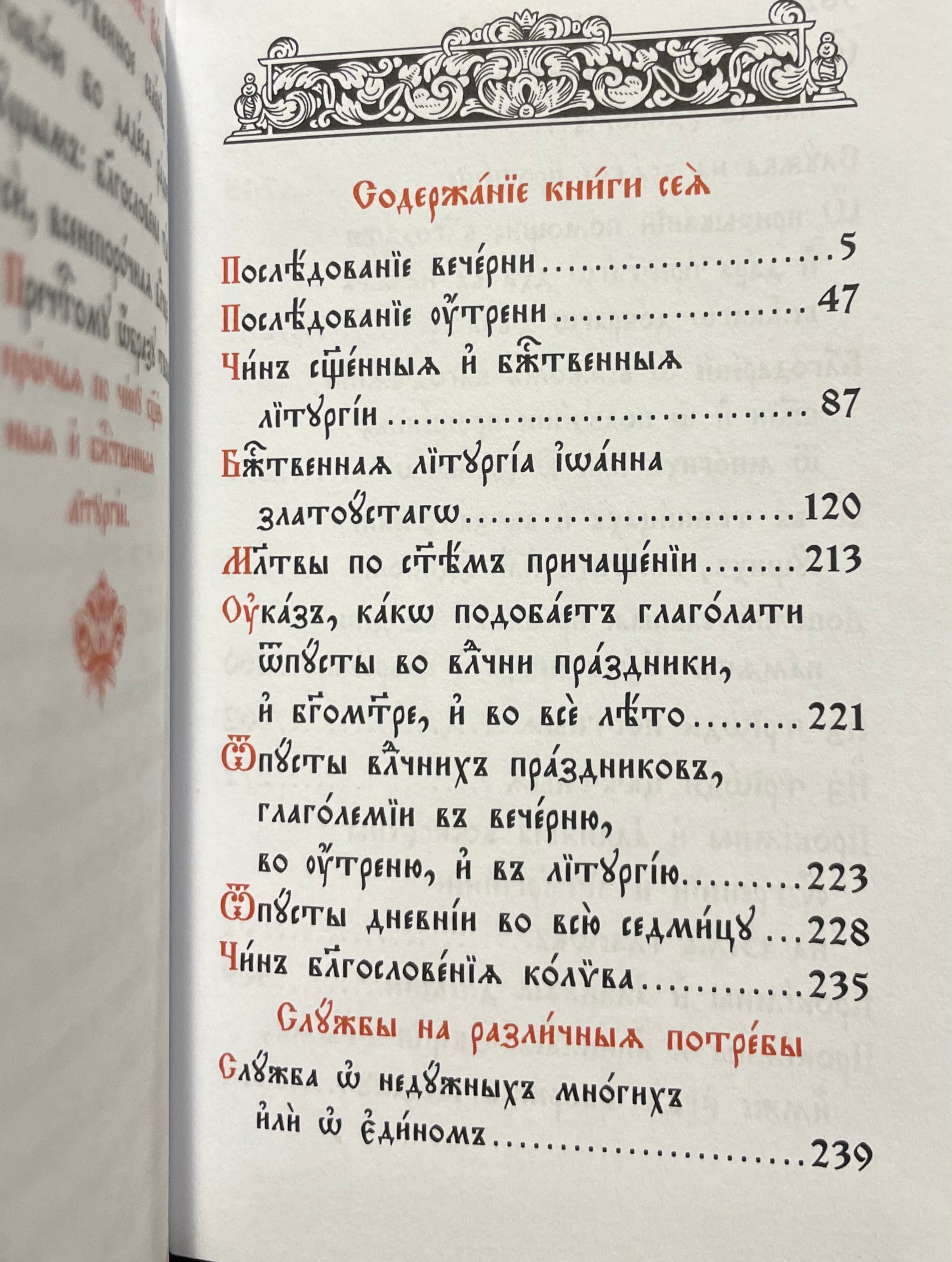 Служебник карманного формата в переплете из экокожи с блинтовым тиснением и с тиснением золотой фольгой. Издание традиционного содержания напечатано в 2 цвета стандартным церковно-славянским шрифтом на офсетной бумаге, имеет скругленные углы блока.
